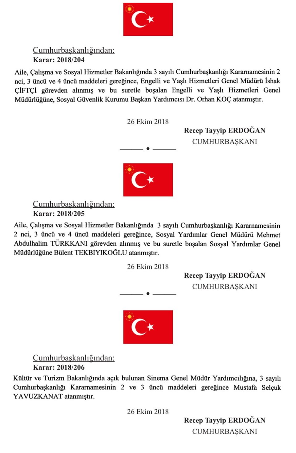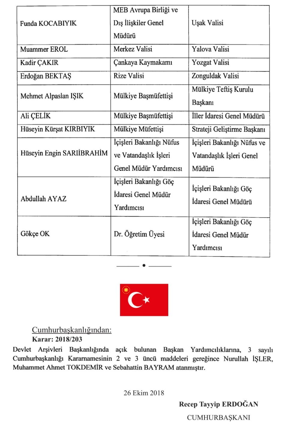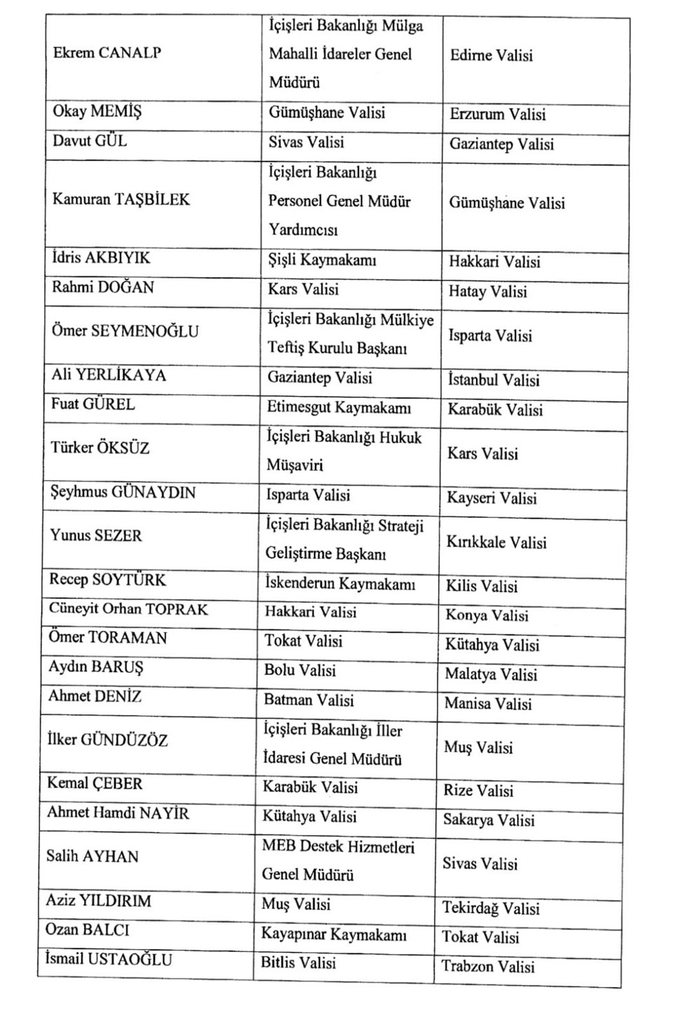 Görevden alınan valiler arasında, Bursa Valisi İzzettin Küçük, Trabzon Valisi Yücel Yavuz, Hatay Valisi Erdal Ata ve Kilis Valisi Mehmet Tekinarslan'ın isimleri dikkat çekti.