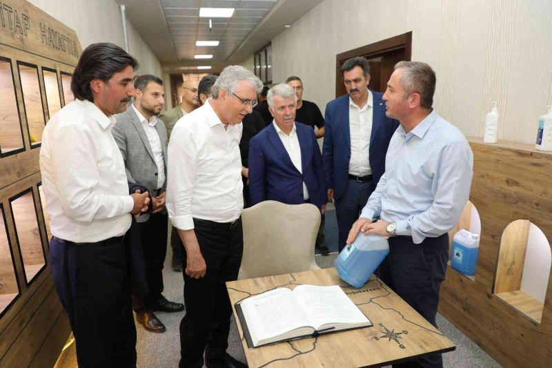 Sakarya Büyükşehir Belediye Başkanı Ekrem Yüce ve beraberindeki heyet, Ağrı İl Milli Eğitim Müdürü Hasan Kökrek tarafından karşılandı. İlk olarak Başkan Yüce’ye "Kütüphanesiz Okul Kalmayacak" projesi çerçevesinde, "Nuh’un Gemisi" şeklinde tasarlanan kütüphane ile TOBB Mesleki ve Teknik Anadolu Lisesinin Kimya Teknolojisi Bölümü öğrencileri tarafından Ağrı Dağı markasıyla üretilen hijyen malzemelerinin sergilenmesi amacıyla müdürlükte kurulan stantları gezdiren Kökrek, makamında Başkan Yüce’ye il genelinde yürütülen çalışmalar ve yeni eğitim-öğretim öğretim yılında hayata geçirilecek projeler hakkında bilgiler verdi. Ziyaretten duyduğu memnuniyeti dile getiren Kökrek, ziyaretten dolayı Başkan Yüce’ye teşekkür etti. Konukseverliğinden dolayı Kökrek’e teşekkür eden Başkan Yüce, Kökrek’e çalışmalarında kolaylıklar diledi. Misafirleri ile bir süre görüşen Kökrek, daha sonra toplu fotoğraf çekiminin ardından misafirlerini yolcu etti.