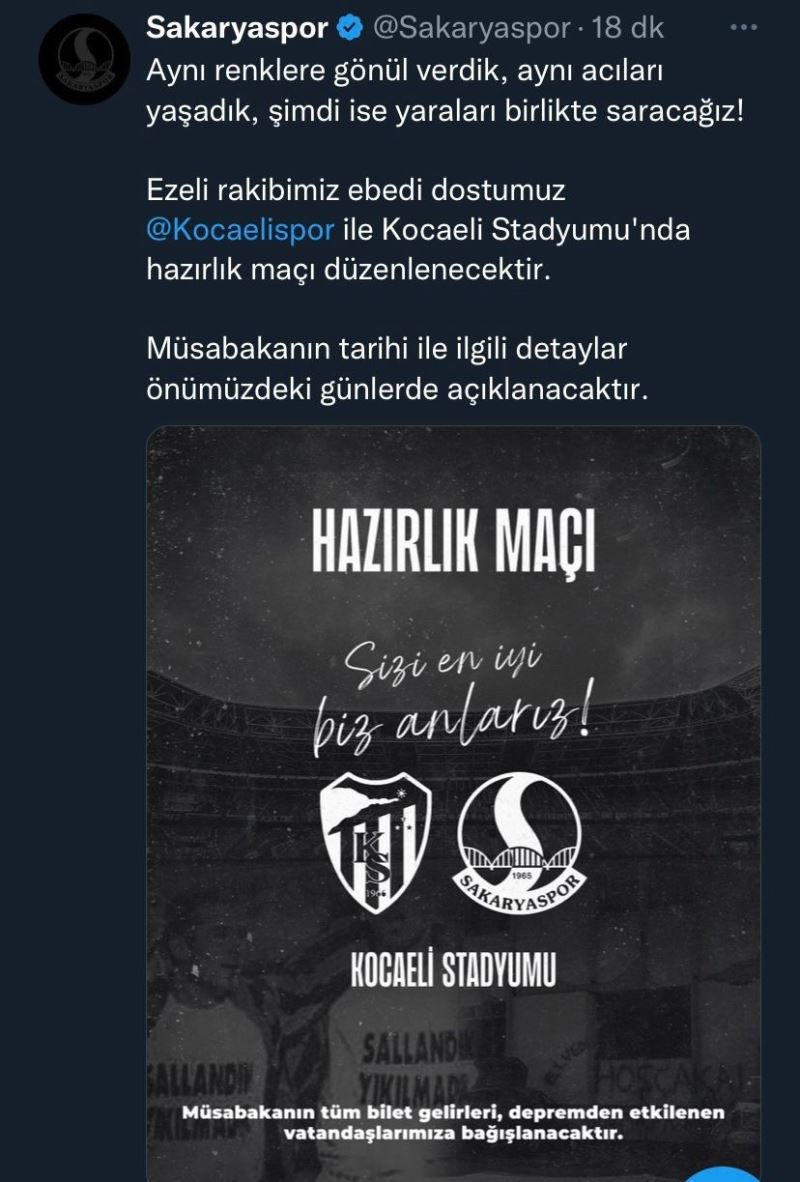 Sakaryaspor ile Kocaelispor arasında hazırlık müsabakası gerçekleşecek. Müsabakadan elde edilen tüm bilet gelirleri ise asrın felaketinin yaşandığı bölgedeki depremden etkilenen vatandaşlara bağışlanacak. Konuyla alakalı olarak Sakaryaspor’un sosyal medya hesabında yapılan paylaşımda, “Aynı renklere gönül verdik, aynı acıları yaşadık, şimdi ise yaraları birlikte saracağız. Ezeli rakibimiz, ebedi dostumuz Kocaelispor ile Kocaeli Stadyumu’nda hazırlık maçı düzenlenecektir. Müsabakanın tarihi ile ilgili detaylar önümüzdeki günlerde açıklanacaktır” ifadelerine yer verildi.