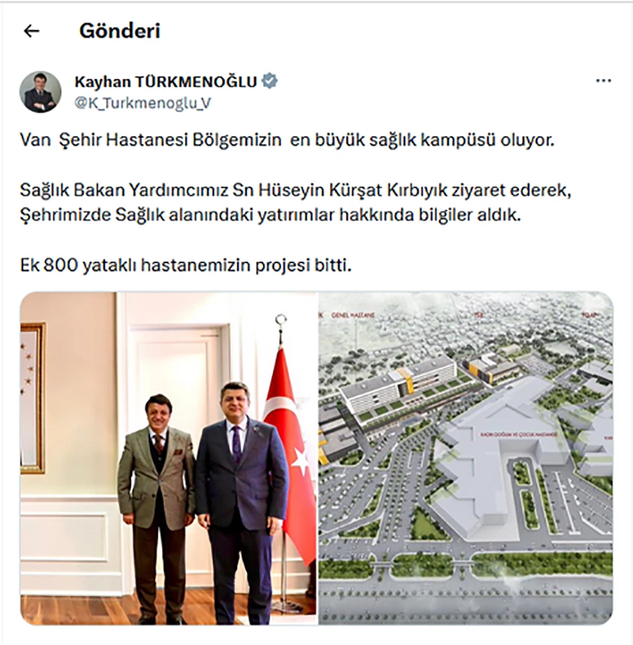 Milletvekili Kayhan Türkmenoğlu’nun sosyal medya hesabından yaptığı açıklamada, “Van Şehir Hastanesi Bölgemizin en büyük sağlık kampüsü oluyor. Sağlık Bakan Yardımcımız Sn Hüseyin Kürşat Kırbıyık ziyaret ederek, Şehrimizde Sağlık alanındaki yatırımlar hakkında bilgiler aldık. Ek 800 yataklı hastanemizin projesi bitti.” ifadelerini kullandı.